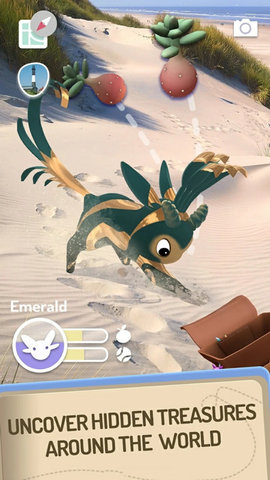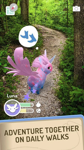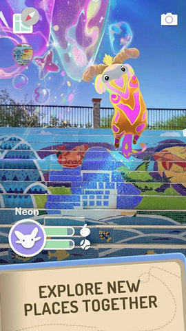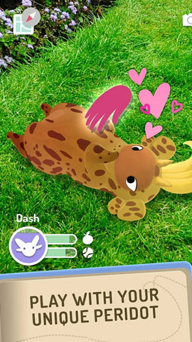 亮点一:无与伦比的增强现实沉浸式养成体验。 与市面上多数将AR作为辅助展示功能的游戏不同,Peridot将AR技术深度融入核心玩法。花宝不仅仅是在摄像头画面中叠加一个模型,它会真实地与你的现实环境互动:躲在茶几后面、在草地上打滚、对路过的宠物狗产生好奇。这种深度的场景融合使得照料花宝的体验极为真实,喂食、抚摸、玩球等互动都通过屏幕直观呈现,建立了远超传统点击式养成游戏的情感纽带。