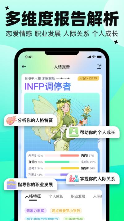 核心性格测评与动态解读:这是软件的基础功能。用户完成经过信效度检验的标准MBTI量表后,系统会生成一份详细的类型报告。此功能解决了用户对自我认知模糊、依赖零散主观印象的痛点。报告不仅确认用户的四字母类型代码,更深入解释每个维度的偏好强度、在具体情境(如工作、家庭、社交)中的典型表现,以及该类型常见的思维与情感模式,将理论转化为生动的个人画像。