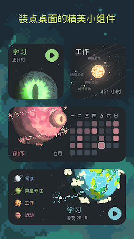 4. 桌面小组件与快速启动:此功能降低工具的使用摩擦,解决打开应用即分心的潜在风险。将当前计时状态、今日累计时长或下一个任务星球直接以小组件形式放置在手机主屏幕。无需解锁手机进入应用,即可一眼掌握进度,并实现一键开始/暂停计时。这种极短的操作路径最大限度地减少了用户因查看进度而陷入其他手机应用的可能性,保障了专注流程的连贯性。
