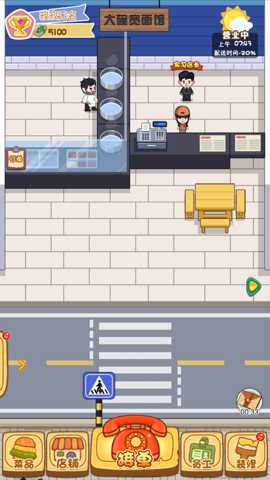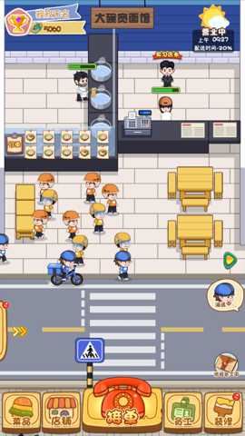 外卖配送系统:这是游戏的策略精髓所在。屏幕上方会不断出现外卖订单,显示需求商品、配送地址和时限。玩家需要从已招募的快递员中拖拽指派。地图上会显示集市街道的实时情况,可能出现拥堵点。玩家需要规划路线,有时需手动点击改变快递员行进方向以避开拥堵,确保在时限内送达。升级快递员或购买更快的交通工具(如电动车)能显著提升效率。高效配送不仅能获得订单收入,还能收获额外好评奖励。