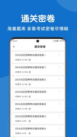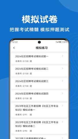 1. 章节精练与智能组卷功能:针对知识体系庞杂,不知从何入手的痛点,软件将社区工作知识体系划分为清晰的章节与模块。用户可按章节进行系统性练习,夯实基础。智能组卷功能允许用户根据知识点范围、题型、难度、题量等参数自定义生成练习试卷,满足阶段性自测或专项突破的多样化需求。