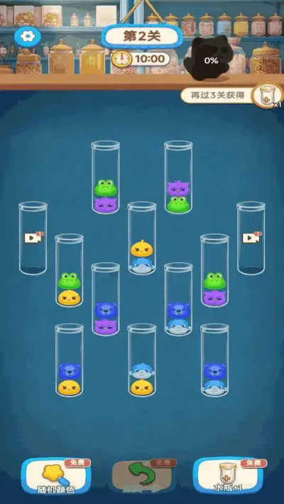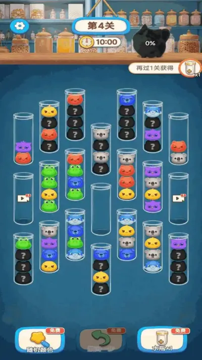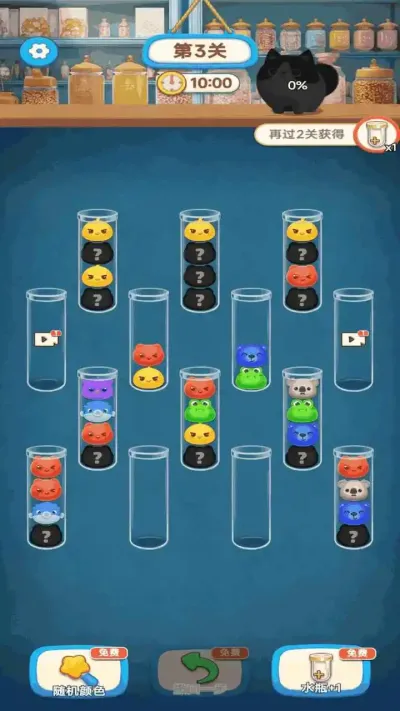 亮点二:策略障碍设计,深化规划挑战。 游戏中的固定障碍色块是点睛之笔。这些无法移动的色块如同磐石,矗立在盘面中,彻底打破了常规的整理节奏。玩家不能再进行直线思维式的归类,而必须学会绕行,以障碍物为支点,精心规划其他方块的移动路径,或巧妙利用道具进行针对性清除。这极大地提升了游戏的深度和可玩性。