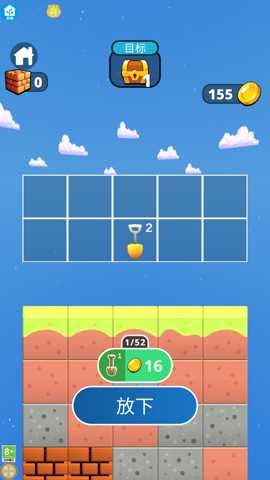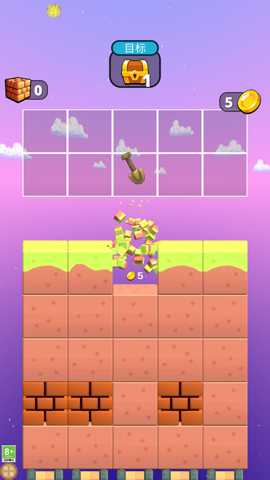 1. 核心操作与挖掘: 玩家进入关卡后,屏幕中央即显示当前地层截面。只需用手指在屏幕上向下滑动或点击想挖掘的位置,角色便会使用铁铲向该方向挖掘。挖掘会消耗少量体力(随时间自动恢复),并清除路径上的泥土、沙石。遇到更坚硬的材料时,挖掘速度会变慢,此时便凸显出高级别铁铲的重要性。