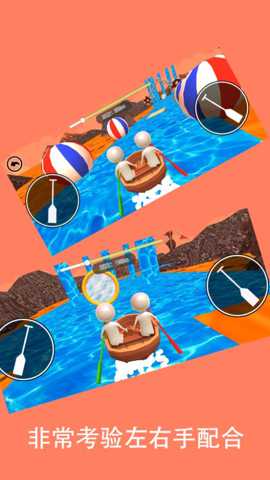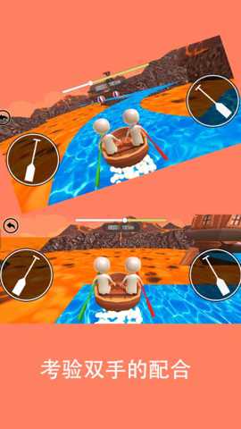 操作方式上,左右两名玩家需要分别控制自己一侧的船桨。推动船只前进的基本原理是同步对称划水:即当左侧玩家向后划动(模拟向后推水)时,右侧玩家也需同步进行向后划动,此时船只获得向前的动力。若想向左转弯,则需要右侧玩家用力划水而左侧玩家轻划或暂停;反之亦然。高级技巧包括加速冲刺(两人极高频率同步划动)和急停转向(一人反向划水)等。玩家的主要目标不仅仅是抵达终点,许多关卡还设置了收集星星、限定时间或避免碰撞的额外挑战目标,从而增加游戏深度。