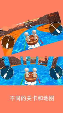 划呀划的核心玩法围绕双人协作划船闯关展开。玩家扮演同一艘小船上的左右桨手,通过触控屏幕进行模拟划桨操作:在屏幕左侧或右侧区域,沿特定方向(通常为前后或弧形)滑动,即可驱动对应的船桨划水。游戏的主要目标是克服当前关卡的所有挑战,从起点安全、快速地抵达终点。