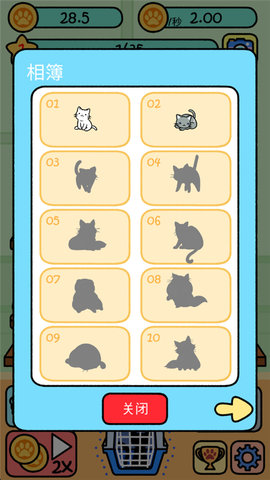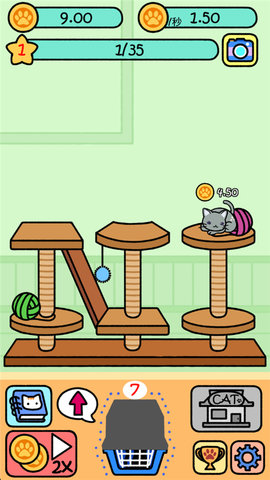 主要玩法与操作方式: 游戏的操作极其简单,完全通过点击和拖拽完成。主场景是您的庭院,猫咪们会在此处悠闲生活。屏幕下方或侧边设有猫箱按钮,点击即可消耗金币开启猫箱,随机获得一只猫咪。将庭院中两只相同品种(相同形象)的猫咪拖拽到一起,它们便会融合进化,变成一只更高稀有度的新猫咪。新猫咪通常拥有更精致的外观和更高的金币产出效率。庭院有猫咪数量上限,初始空间有限,需要通过提升玩家等级来扩容。
