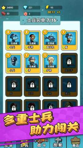 2. 部队招募与养成: 在相应的建筑中,你可以消耗资源招募士兵。招募后,士兵还可以在训练场中进一步提升等级和技能。你需要为部队配备和升级武器。通过关卡掉落、活动奖励或商城购买获得武器和碎片,在工坊中进行合成与强化,极大提升部队的战斗力。