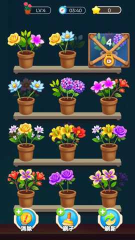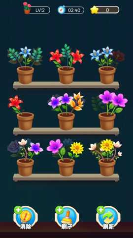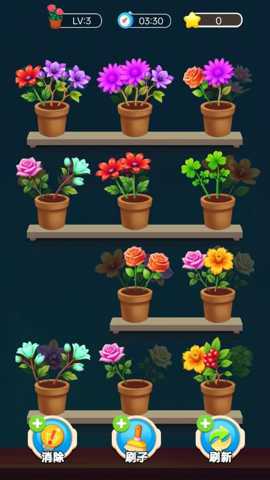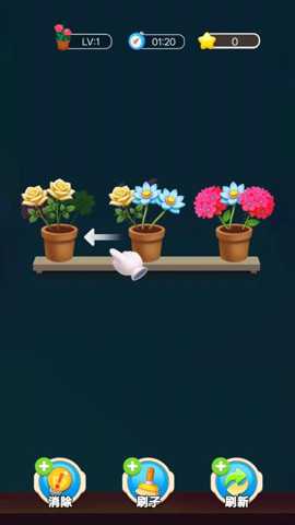 主要操作方式:游戏全程通过触屏点击和拖拽完成。玩家可以点击屏幕上任意一朵可移动的花朵,将其拾起,此时花朵会跟随手指移动。屏幕上会分布着多个空的花盆(通常位于画面底部或特定区域)。玩家需要将拾起的花朵拖拽到一个空花盆上并松开手指,即可完成放置。当一个花盆内被放入三朵相同的花朵时,就会触发消除特效,这三朵花会从花盆中消失,并为玩家增加分数,腾空该花盆以供后续使用。如果放置错误(如将玫瑰放入已有两朵百合的盆中),玩家可以再次点击该花朵将其拾起重新放置,或者点击其他花朵进行替换,操作非常灵活。