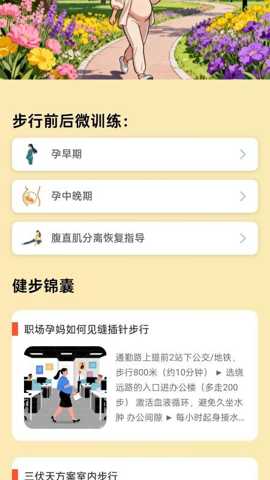 二、孕期安全运动指导系统。针对孕期女性既想保持适度活动又担心运动不当影响胎儿的核心焦虑,软件提供了分孕周的定制化步行训练课程。每个课程均明确标注适合的孕周阶段、训练目标、注意事项及禁忌动作。针对孕中期腰背压力增大的问题,课程会融入增强核心肌群的特定步行姿势指导。该功能通过提供权威、安全的标准化方案,消除了用户自行搜索信息时面临的信息混杂与安全性疑虑,确保了孕期锻炼的有效与安心。
