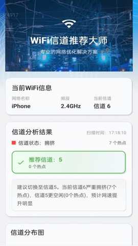2. 专业的无线网络诊断与可视化优化建议:针对用户家庭或常用网络环境,软件提供了深度的网络诊断工具。它可以对已连接的WiFi进行信道分析,以图表形式清晰展示当前信道及相邻信道的占用状况,识别出同频或邻频干扰源。基于此分析,软件会提供专业的优化建议,建议将路由器切换至更为空闲的信道,从而有效降低数据包冲突与重传率,提升网络吞吐量,解决因环境干扰导致的网速波动、视频卡顿、游戏高延迟等具体痛点。