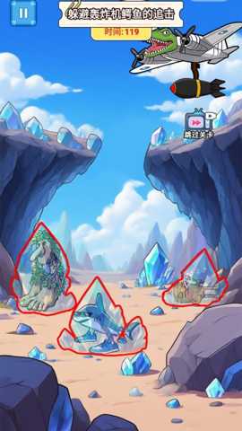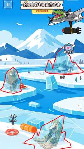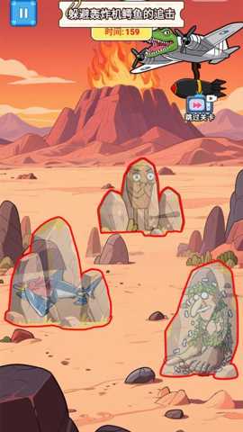 亮点二:动态躲避机制深化益智玩法,考验多维能力。 游戏创新性地在静态观察玩法中加入了动态的生存压力。玩家并非找到目标即可,还需时刻关注空中盘旋的轰炸机,利用地形(如石头、冰块)进行实时躲避。这要求玩家分配注意力,兼顾寻找与生存,将传统的益智游戏升维成对观察力、反应速度和短期记忆力的综合挑战。相比之下,同类游戏大多停留在静态谜题层面,玩梗大闯关的这种设计大大增强了游戏的紧张感和策略深度。