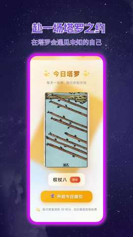 其二,个性化每日运势抽牌与解读功能。此功能解决用户对日常生活指引的即时性需求。用户每日可进行一次专属抽牌,系统会结合当天的宇宙能量(如月相)与用户的个人星座档案,从78张牌中随机抽取一张作为当日主题牌,并提供长达数百字的深度解读。解读内容不仅分析该牌对当日情绪、机遇与挑战的象征,更会结合小阿卡那的四个元素,给出在行动、情感、思考、务实四个方面的具体建议,帮助用户有意识地将塔罗的启示融入全天生活。
