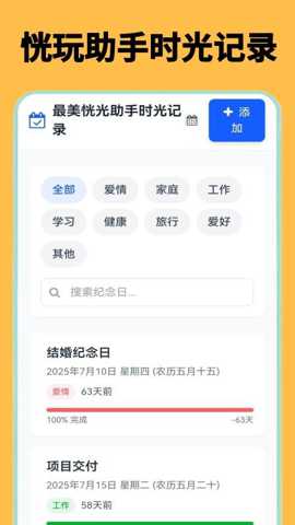 软件引入了基于时间轴的情景化生活管理模块。该模块的创新之处在于将事件管理与情感记忆相结合。用户不仅可以按爱情、家庭、工作等维度分类记录事项,更能为每个事件(如纪念日)赋予情感标签和视觉符号。系统提供的倒计时/正计时状态显示(如项目交付日:剩余15天或结婚纪念日:已度过63天),并非简单的数字提示,而是通过可视化的时间流呈现,帮助用户形成对时间跨度的直观感知,从而更好地进行未来规划与过往回顾,实现了工具理性与人文关怀的结合。
