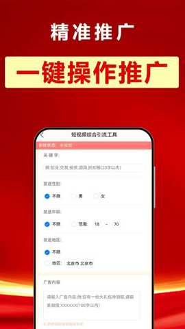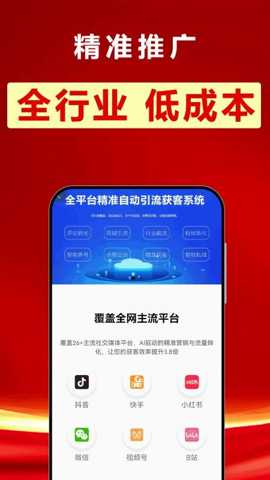 精准推广是一款面向企业用户的自动化客户获取与营销管理软件,其核心功能在于整合多渠道推广资源,通过智能算法实现潜在客户的精准识别与触达,从而显著提升企业在数字营销领域的获客效率与转化率。软件深度对接抖音、快手、微信、B站等主流社交媒体平台,为企业提供从方案策划、内容投放、数据追踪到效果分析的一站式解决方案,帮助企业在激烈的市场竞争中以更低的成本和更高的精度实现业务增长。