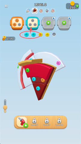玩家的核心策略与技巧: 1. 观察先行: 切勿盲目点击。首先全面旋转检查模型,识别出哪些螺丝是关键螺丝(连接部件最多的),哪些是目标螺丝(所需颜色),并初步判断它们之间的依赖关系。2. 逆序推理: 从你想要最终取出的那颗目标螺丝开始,反向思考它被什么挡住,移除那些障碍又需要先做什么,一步步倒推出最优的操作序列。3. 结构预判: 在拧动螺丝前,想象一下移除它后,模型的哪些部分会失去支撑、是否会旋转或掉落。这能帮助你避免走入死胡同。4. 颜色管理: 优先收集目标颜色的螺丝,但有时为了拿到深层的目标螺丝,不得不先移除外围的非目标螺丝。需要平衡短期目标与通关必要条件。随着关卡深入,会出现更多复杂元素,如多种颜色目标存在、螺丝类型(普通、锁死、联动)变化等,对玩家的全局规划和应变能力提出更高要求。