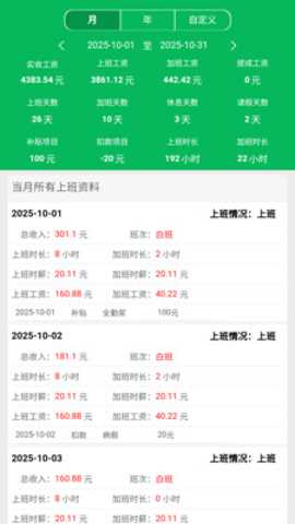 3. 全景式数据统计与可视化报表:软件提供多维度的统计仪表盘和可导出的报表。功能包括:工时分布图(展示各类工时的占比)、收入构成图(展示基础工资、加班费、奖金等组成部分)、历史趋势图(展示月度总收入或总工时的变化曲线)。这些可视化分析功能,解决了用户面对纯数字表格时难以直观感知工作模式与收入关联的痛点,帮助用户快速识别高价值工作时间段或低效月份,从而优化工作安排与精力分配。