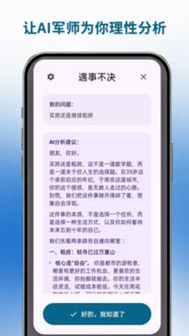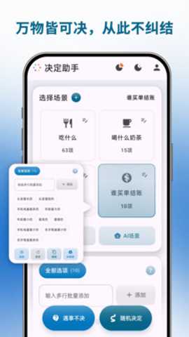决定助手是一款专为选择困难症用户设计的智能决策辅助软件,它通过整合多种决策模型与人工智能分析技术,帮助用户在日常生活、餐饮选择、周末规划乃至更复杂的职业决策等场景中,高效、科学地做出决定。软件核心在于将传统的随机选择方法(如掷骰子、抽签)与基于数据的智能建议相结合,不仅简化了决策流程,还通过引入趣味性交互元素,降低了决策过程中的心理负担和焦虑感,从而提升用户的决策效率与满意度。