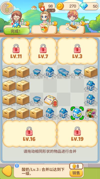 1. 合并+经营双链驱动深度玩法:游戏并非简单地将合并作为资源获取手段,而是将其深度嵌入经营的核心循环。合成升级商品直接关系到店铺的盈利能力、顾客满意度及订单完成度。这种设计使得每一次合并都充满策略性,玩家需要思考资源分配、生产线优化与市场需求之间的平衡,避免了玩法上的单调与割裂感,带来了更持久和深度的游戏体验。