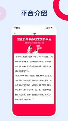 C位是一款面向安徽省各级机关单位在职单身人士的实名制社交软件,由安徽省直属机关工会工作委员会牵头指导,合肥无独有偶文化传媒有限公司负责日常运营与维护。软件的核心设计理念在于为工作环境相对固定、社交圈层较为集中的机关职工群体,构建一个安全、可靠且高效的线上社交平台。其运作基础是严格的实名身份审核机制,通过与工会及单位系统的数据对接,确保用户背景的真实性与可靠性。平台不仅提供基于职业特性和兴趣标签的智能匹配功能,更注重线上互动与线下实体活动的有机结合,系统化地组织各类联谊会、主题沙龙及文体活动,帮助用户突破日常工作生活的局限,在值得信赖的环境中拓展人际网络,解决婚恋交友的实际需求。