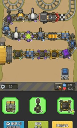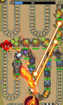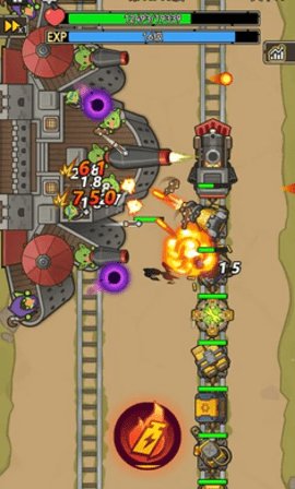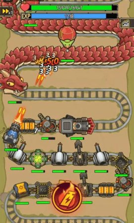 操作方式与基础循环:游戏采用直观的触控操作。在战斗准备阶段,玩家可以进入车厢管理界面,使用获得的资源对每节车厢进行三段式改造(从基础车厢升级为重型武器平台),并在其上搭载如速射机枪、喷火装置、冰冻炮台等不同属性的武器模块。在战斗过程中,哥布林会从火车前方、两侧甚至后方袭来,玩家需要点击轨道分支点来切换火车行进路线,以规避危险或利用地形,可以手动点击激活武器技能(如冰冻炮台的瞬间冷冻)或使用诸如应急隔断门、手动释放蒸汽压力等特殊指令来应对危机。每波战斗结束后,会获得资源用于升级和修复,形成战斗-收获-建设-再战斗的成长循环。