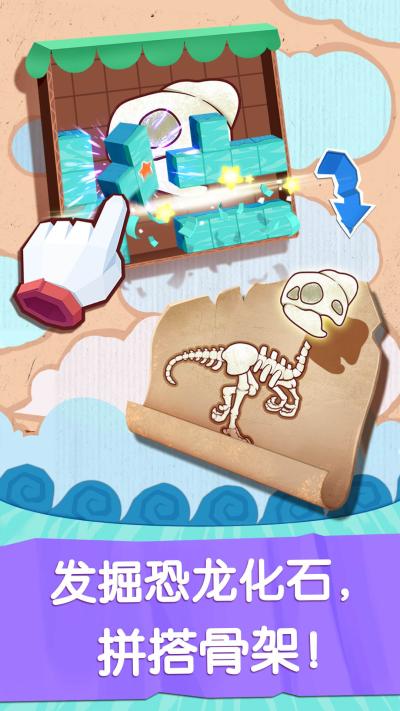 是深度拟真的探索与考古系统。游戏中的化石挖掘并非简单的点击即得,而是模拟了真实的地质分层。孩子们需要按照岩层顺序,选择合适的工具进行敲击,每一层都可能出现惊喜,或是恐龙骨骼碎片,或是闪闪发光的宝石。这种设计不仅增强了游戏的趣味性和悬念感,更在无形中向孩子传递了考古工作的基本逻辑和地质知识。