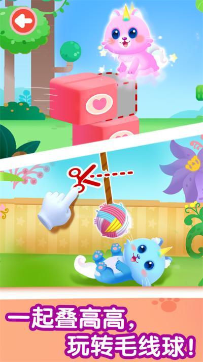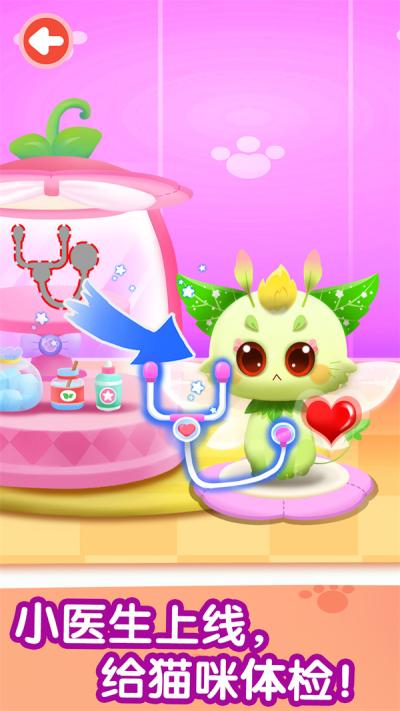 主要玩法与操作方式: 游戏以猫咪小屋为主要场景,采用直观的触屏点击、拖拽和滑动进行操作。玩家的日常核心活动包括:1. 基础照料:通过点击食物碗进行喂食,拖拽澡盆为猫咪洗澡,使用各种玩具(如逗猫棒、毛线球)进行互动玩耍。2. 健康管理:在医疗站,使用拖拽操作使用温度计、听诊器等工具为猫咪做检查,并根据诊断结果,从药柜中选取药品进行治疗。3. 迷你游戏:进入特定的游戏场景,如蹦床广场、魔法纸箱迷宫、毛线球乐园。在蹦床玩家需要滑动调整蹦床角度,点击控制弹跳时机;在捉迷藏需快速点击记忆中的正确纸箱;在毛线球关卡,则需要点击选择剪断的绳索。4. 场景探索与装饰:玩家可以自由探索多个地图,点击发现隐藏物品或触发事件。可以进入装饰模式,拖拽家具、玩具、服饰来布置小屋和打扮猫咪。